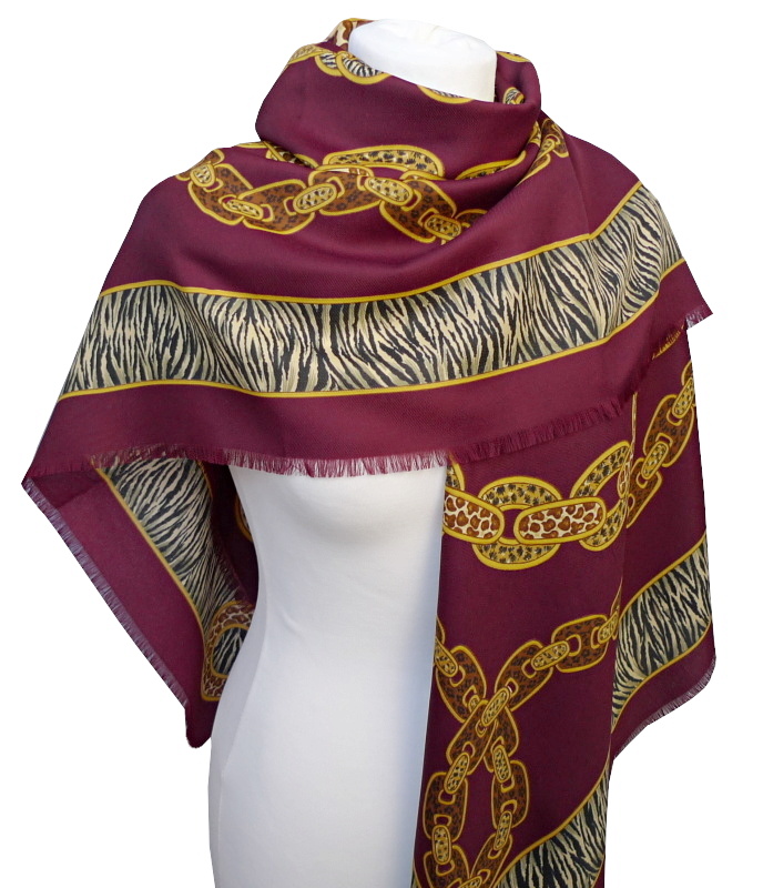 großes Damen Tuch, Kopftuch, Umschlagtuch mit Ketten, animal print, boredaux rot, ocker