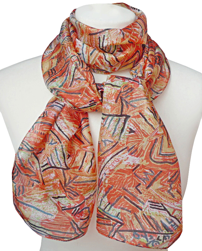 leichter Damenschal aus reiner Seide, geometrische Muster, orange, grün, schwarz, weiß, gelb