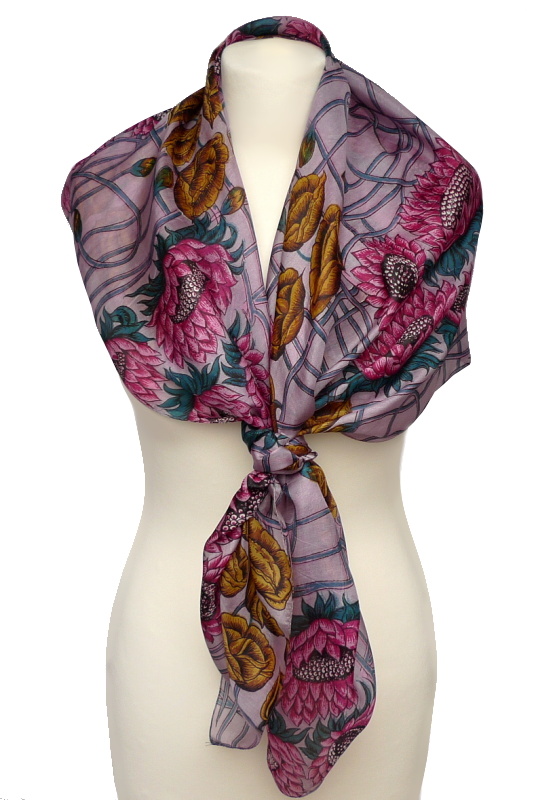 wunderbares Damen Seidentuch mit Seerosen, lila, rot, braun, grün
