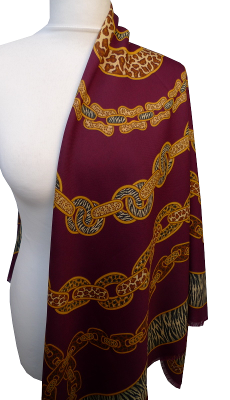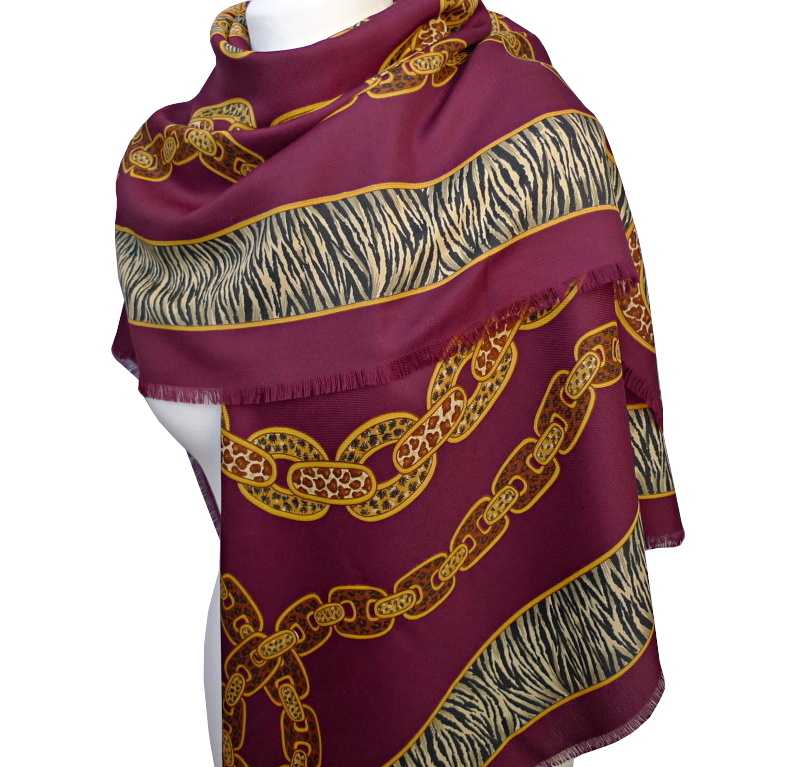 großes Damen Tuch, Kopftuch, Umschlagtuch mit Ketten, animal print, boredaux rot, ocker